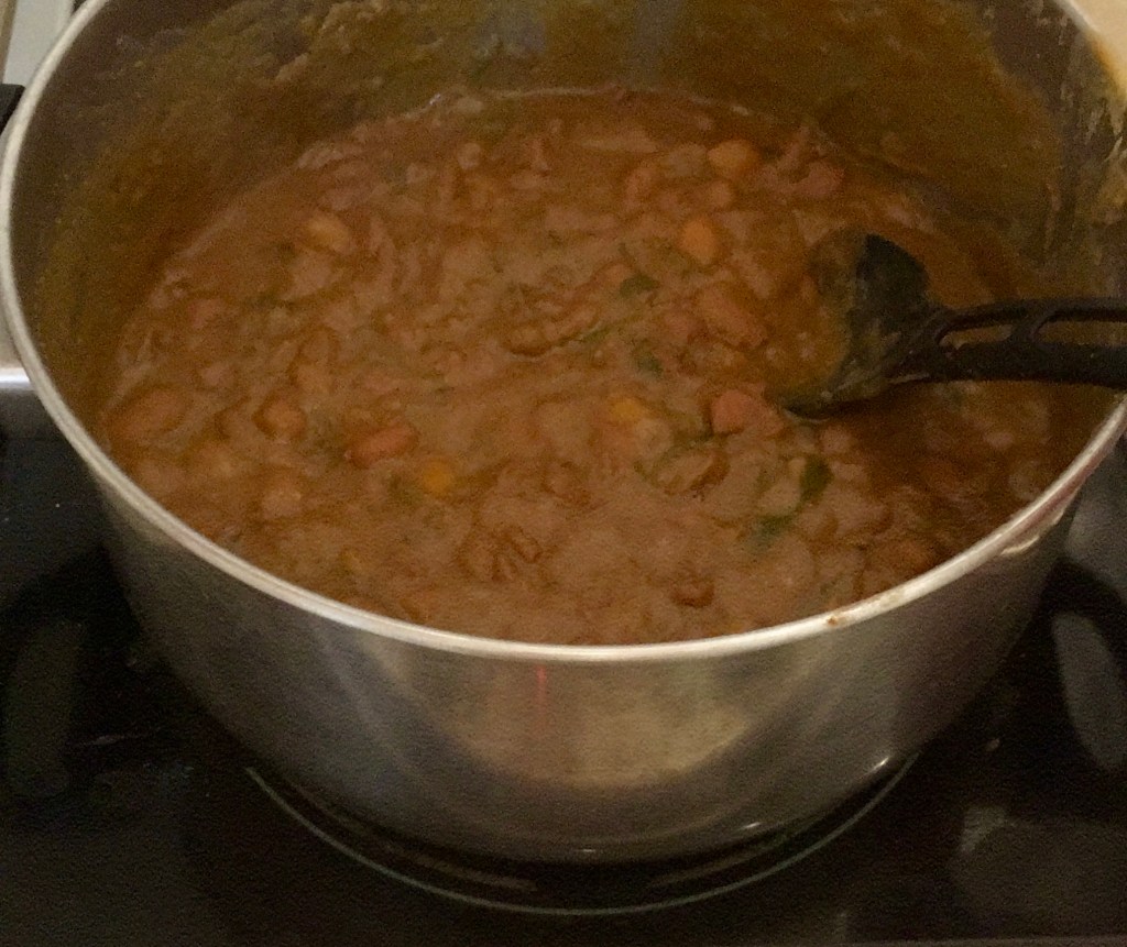 1. Soak the beans (for a minimum of an hour to overnight) and cook with the rest of the Ingredients in 4 cups of water over medium low heat until the beans are soft enough to mash and the liquid is reduced. This will take a while, but does not take much supervision.