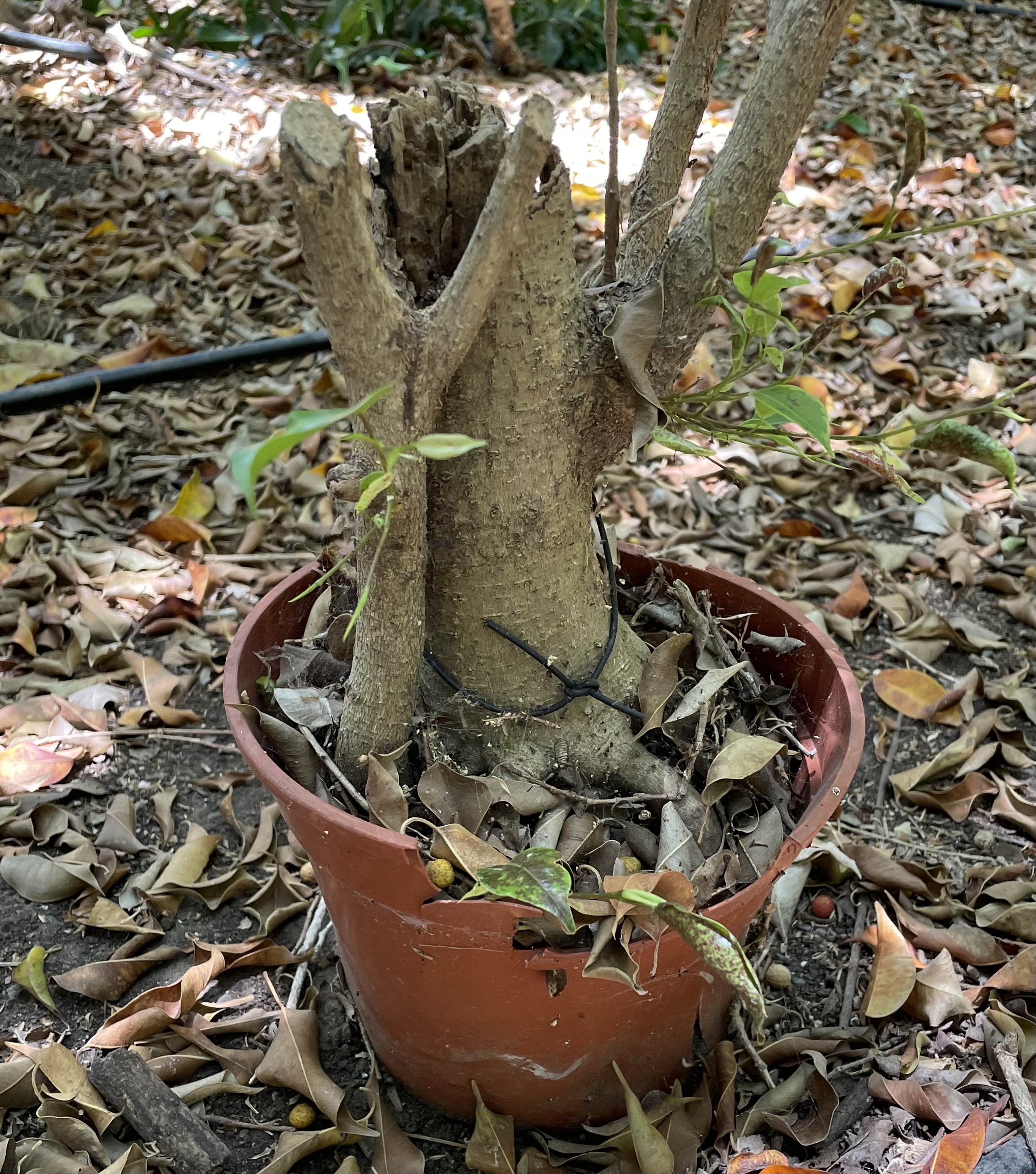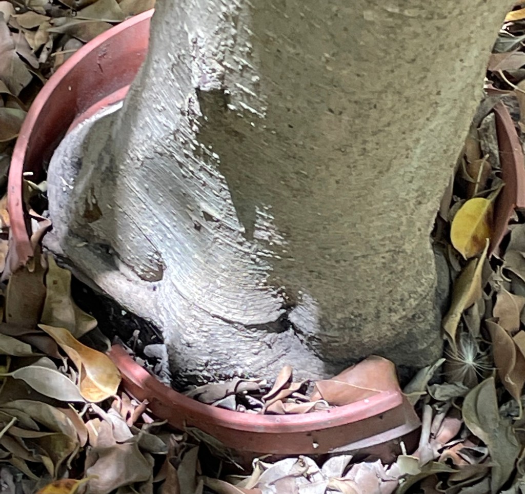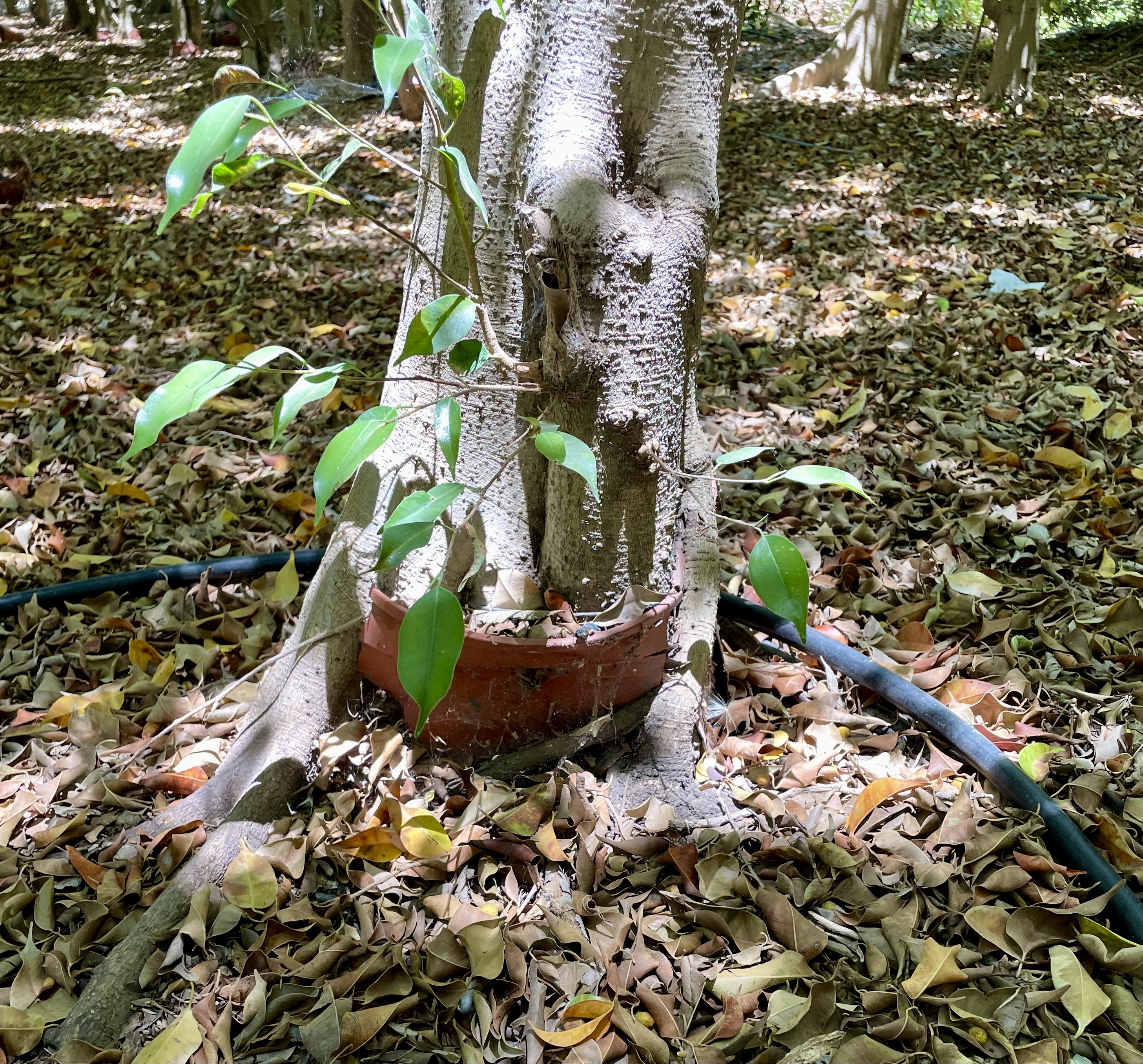 We also learned a bit about the history of the location, which some time back had been a plant nursery, growing trees, among other things. Bein Hatlamim is now surrounded by verdant groves of ficus trees that started out as seedlings in pots and took root, becoming a permanent part of the landscape and providing pleasant shade at the height of summer. Looking at the trees up close it is amazing to see how many of the pots are still in evidence, decades later.