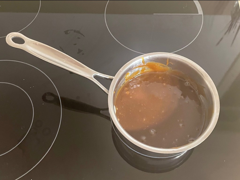 To make the caramel mix the almond butter, date syrup(Silan), Coconut Sugar, and Water and bring to a boil over medium low heat, stirring constantly.