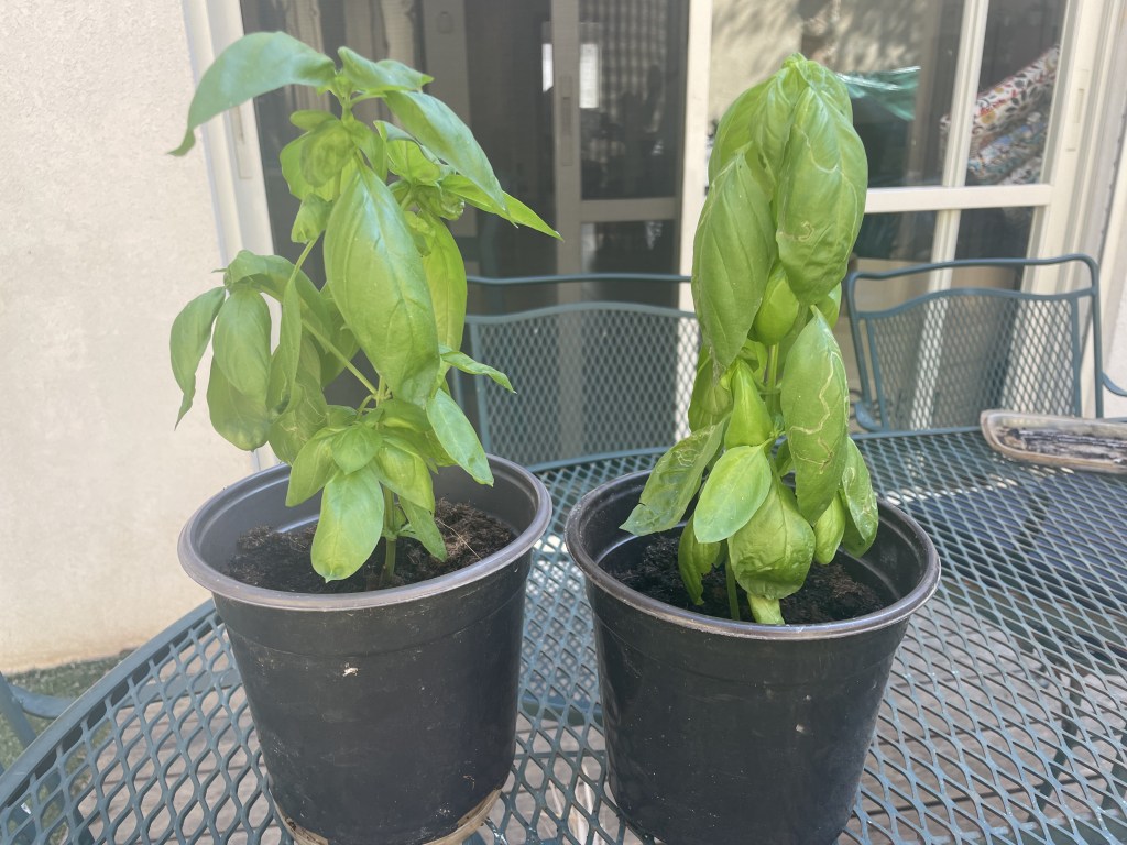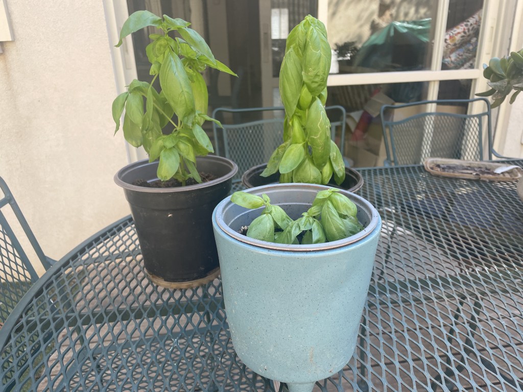 After my first experience, I decided to do it again. Above are photos of my second cloning experiment – two additional sprigs taken from the old basil plants that have grown well and now also are in their own pot.