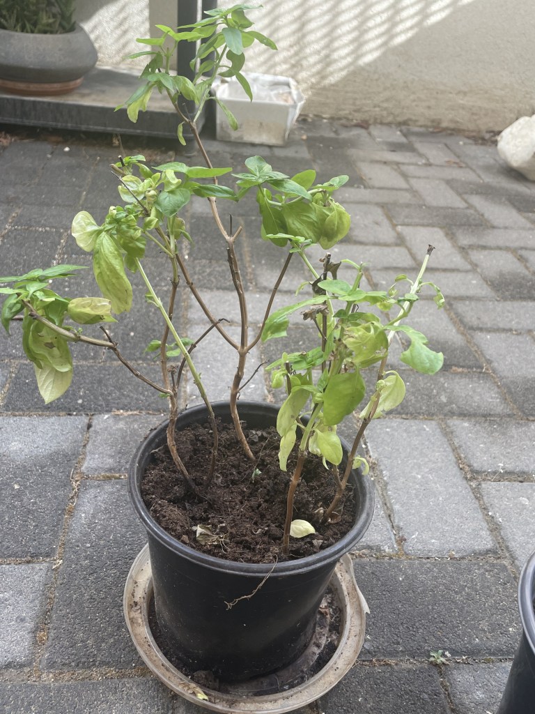 Cloning duplicates plants; in my experience my cloned basil plants appear stronger, with larger and more attractive leaves than those of the “donor” plant. Above is an example of an existing basil plant at the end of the summer – leggy, with small leaves.