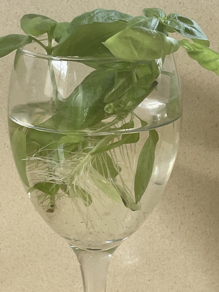Literally all you need is a few sunny spot (a few square inches) that is not too cold, a glass of water and a sprig of basil. And for anyone with children at home, it is a fun small science experiment – a great way to show how plants can reproduce without seeds / seedlings. Please let me know If you try this at home.