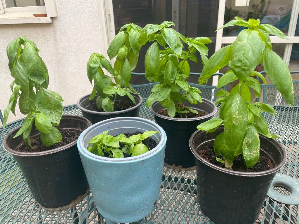 (Over the years I have found growing basil from seed a bit onerous – it takes a long time and can be disappointing. My usual routine is to start with seeds in the spring, and usually end up also planting seedlings over a period of weeks or months. Actually I find that when I finally go out and get the seedlings, then the seeds I planted seem to do a bit better and I end up with both.)