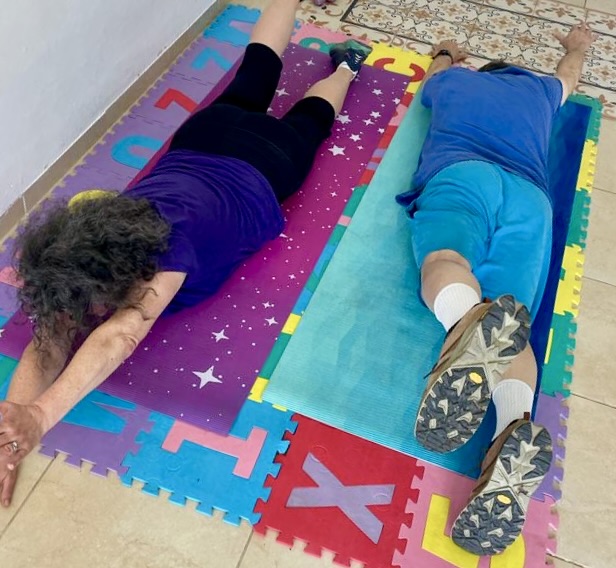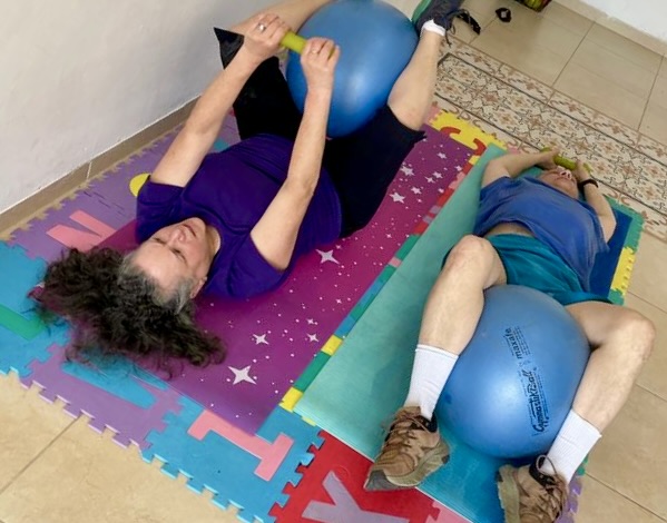 - chair exercises where you share a ball/ band and alternate exercises together,