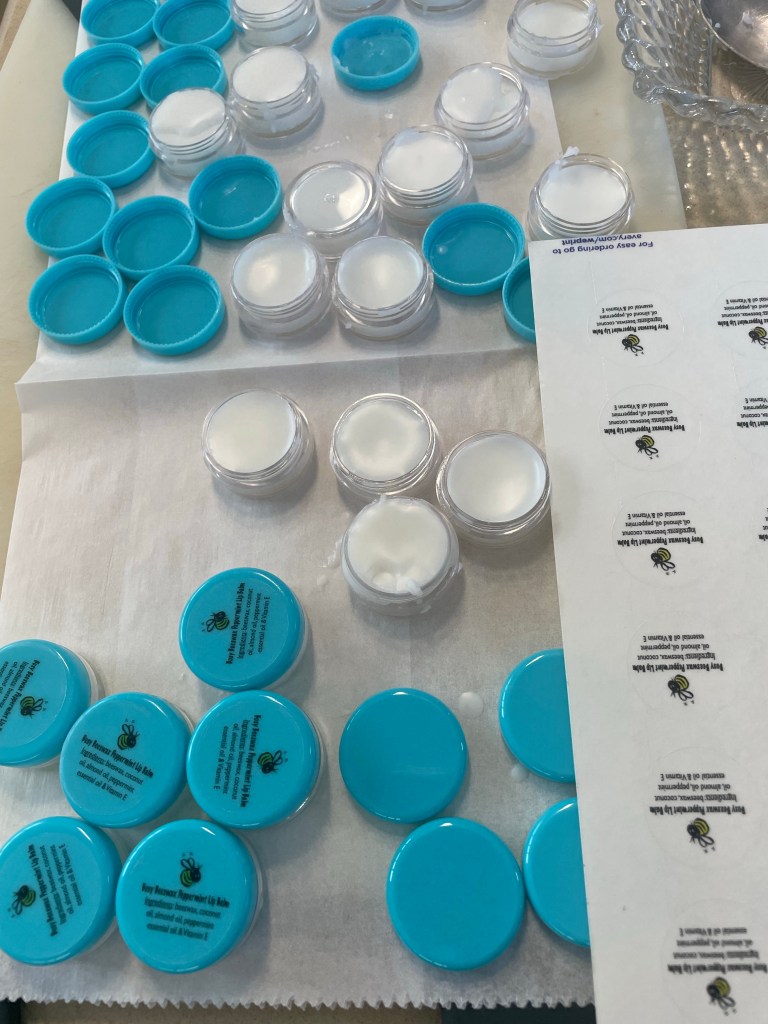 When the Beeswax and Coconut Oil have melted, remove the measuring cup and add remaining ingredients, then pour the lip balm into containers while it is still liquid.
