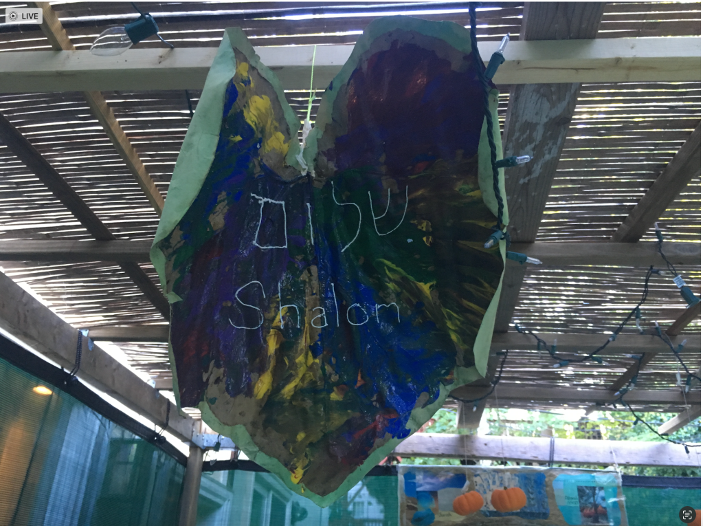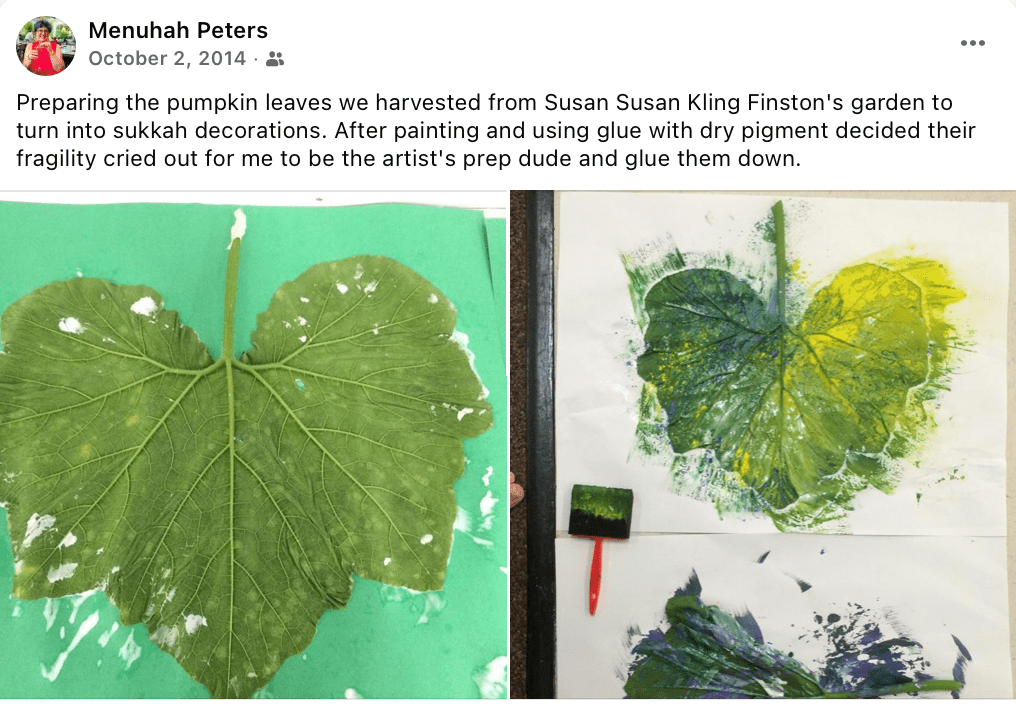 When our time together coincided with Jewish holidays, she found a way to use materials from my garden in the classroom. Below are a few ways that she used pumpkin leaves as Sukkot decorations – one of which she gave to me to use in our Sukkah: