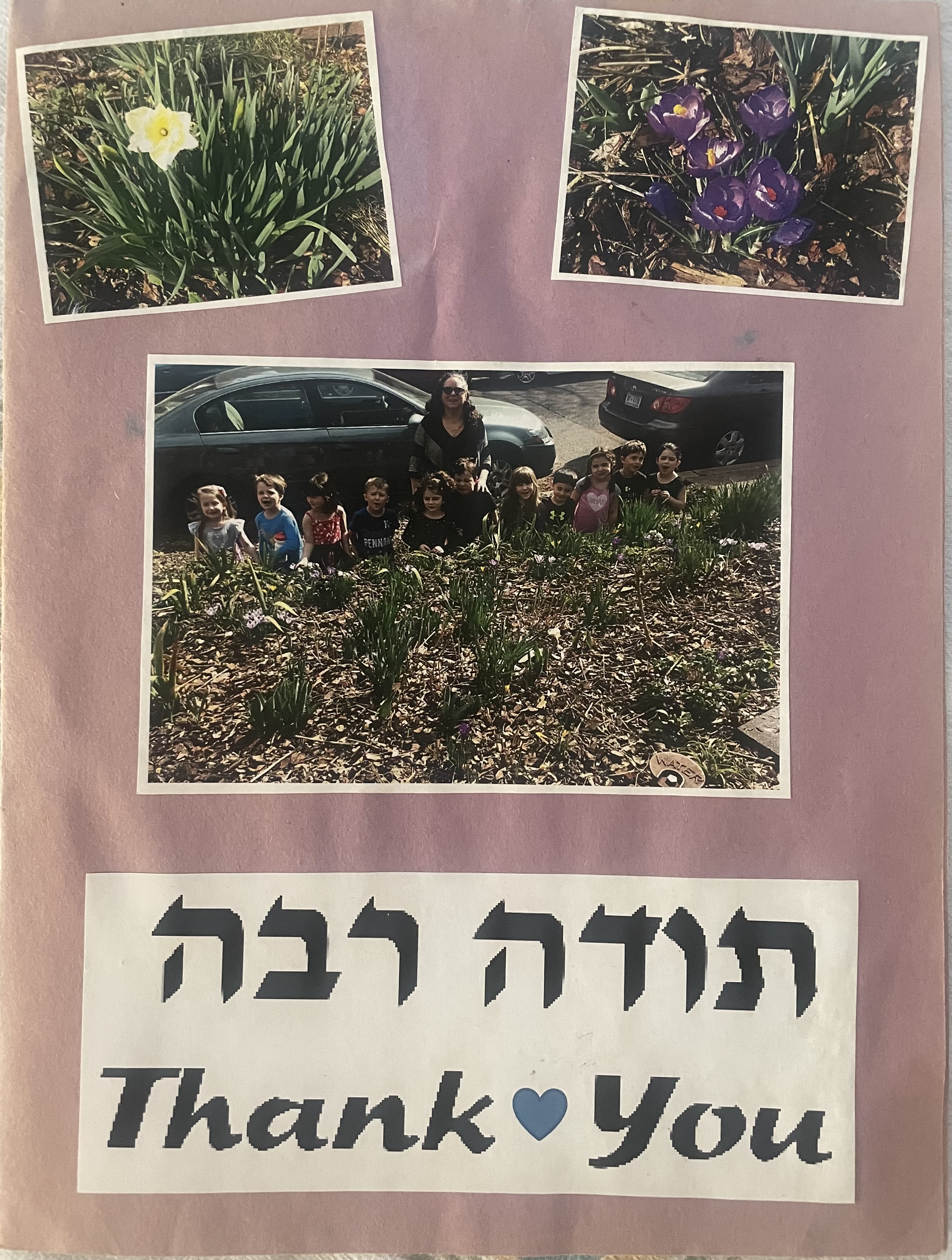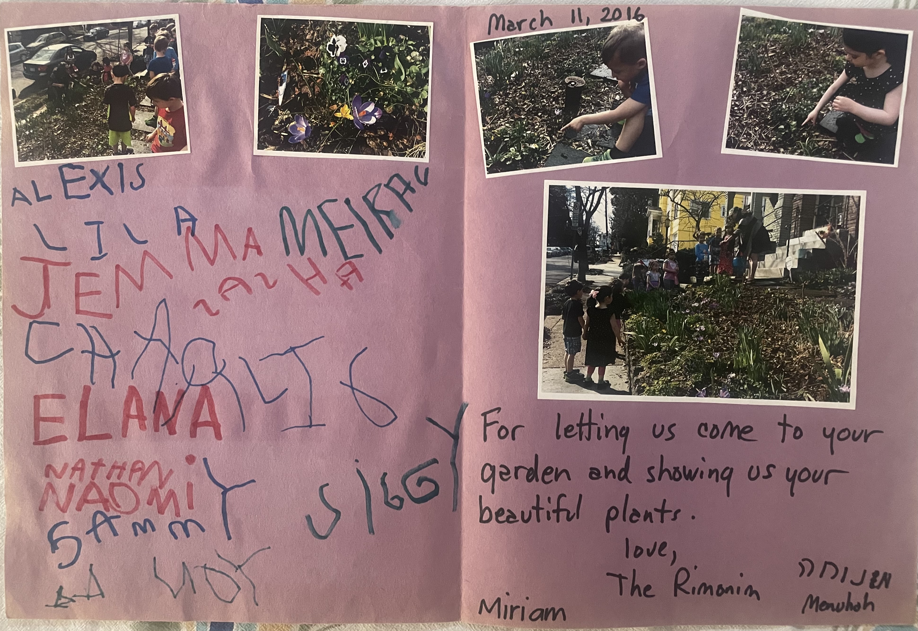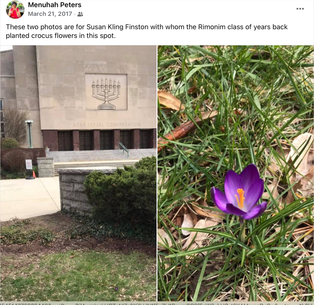 We had one other very meaningful gardening experience planting crocus bulbs in a small corner of the Adas Israel front lawn in November 2013. My understanding is that the crocuses bloomed annually, ever since, as captured below by Menuhah in 2017. I hope that the crocuses may have naturalized and spread, to serve as an enduring memorial to Menuhah’s invaluable contribution to Adas Israel. I would love to hear from anyone who may have seen them in bloom over the years.