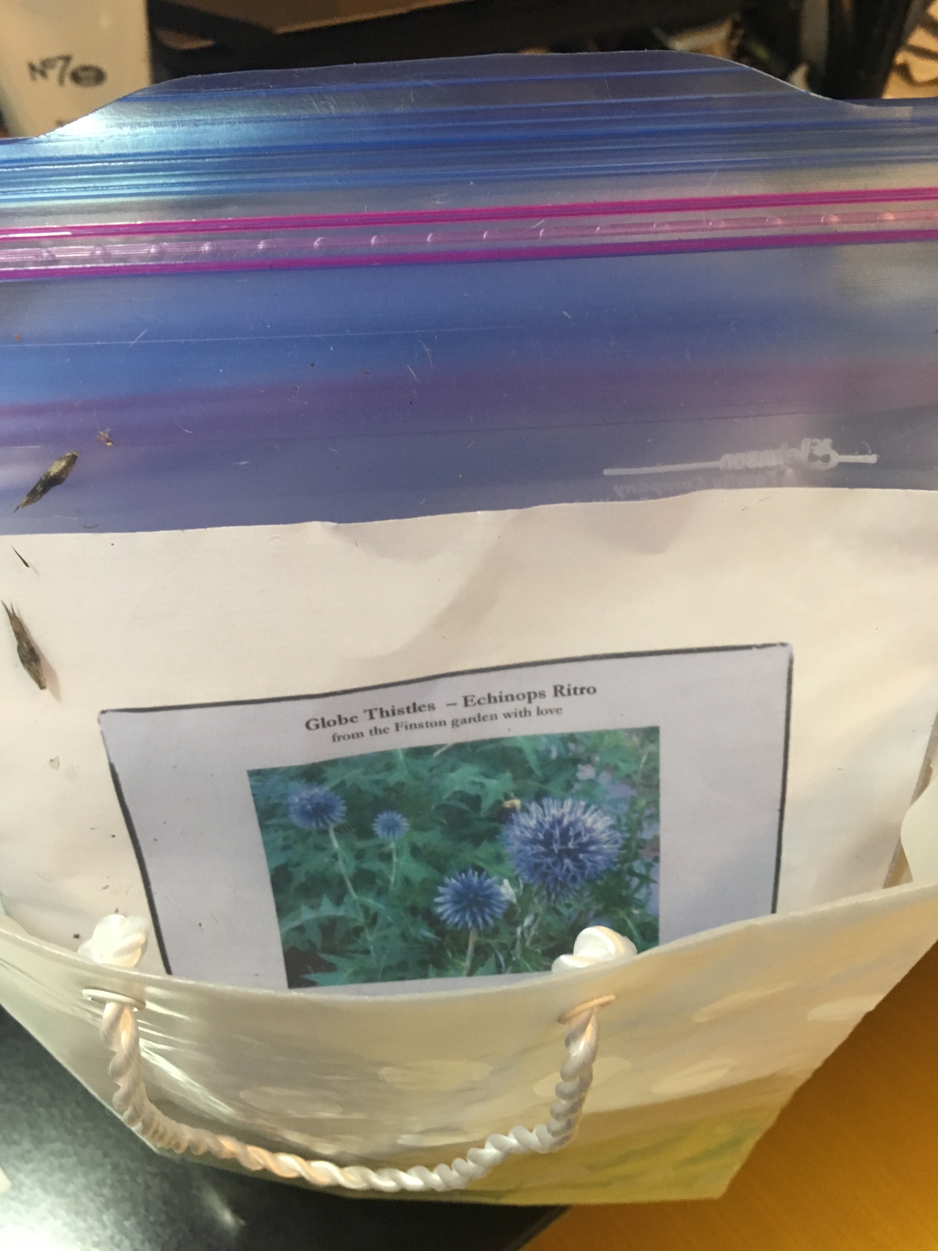Some of Menuhah’s posts remind me of long forgotten events, like harvesting seeds from purple globe thistles (echinops ritro) to give to the children. In the post below she celebrates the plant that one student was able to grow from the seeds. (After seeing her post I found a few photos of how I had packaged the seeds, also included below.)