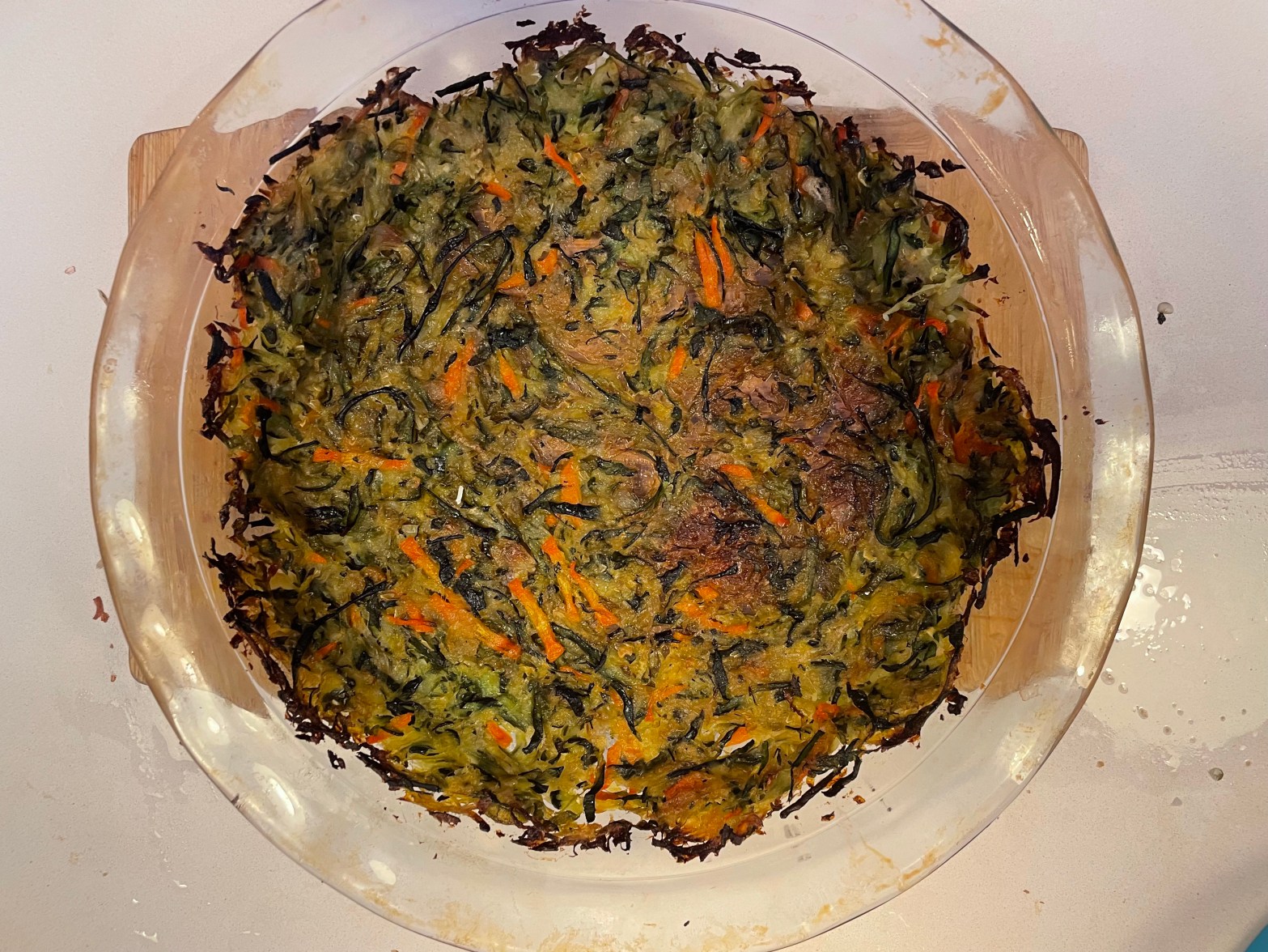 As an alternative piecrust for vegetable pies/quiches, I have been experimenting with gluten-free, vegan and lower-carb substitutions for the traditional wheat-based crust. In the past, I have used shredded potatoes seasoned with onion or shallot and garlic for a Passover-friendly pie crust, and so I thought I would try using different vegetables for a lower-carb alternative crust.